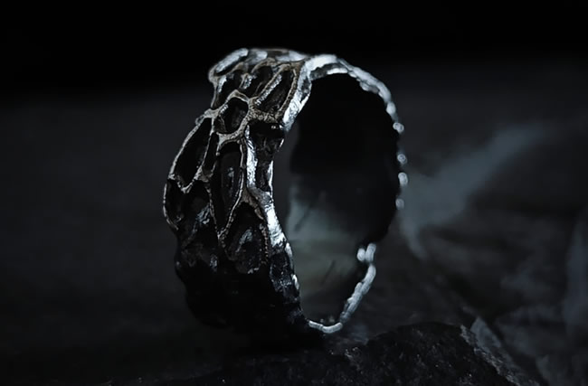 Anillo Kivi: Textura de rocas con poros y grietas. (Se siente como una piedra real, pero en plata fina.)